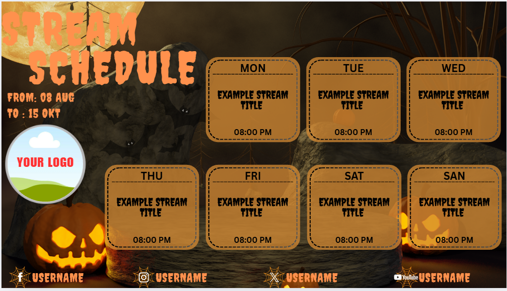 Each day includes space for stream titles and streaming time, making it easy for audiences to know when and what content will be streamed.